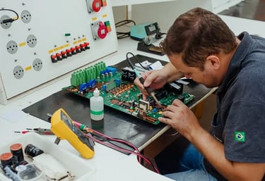 Realizamos serviços de manutenção em inversores de frequência, soft starters, disjuntores, CLPs, elevadores e outros equipamentos eletrônicos industriais.
